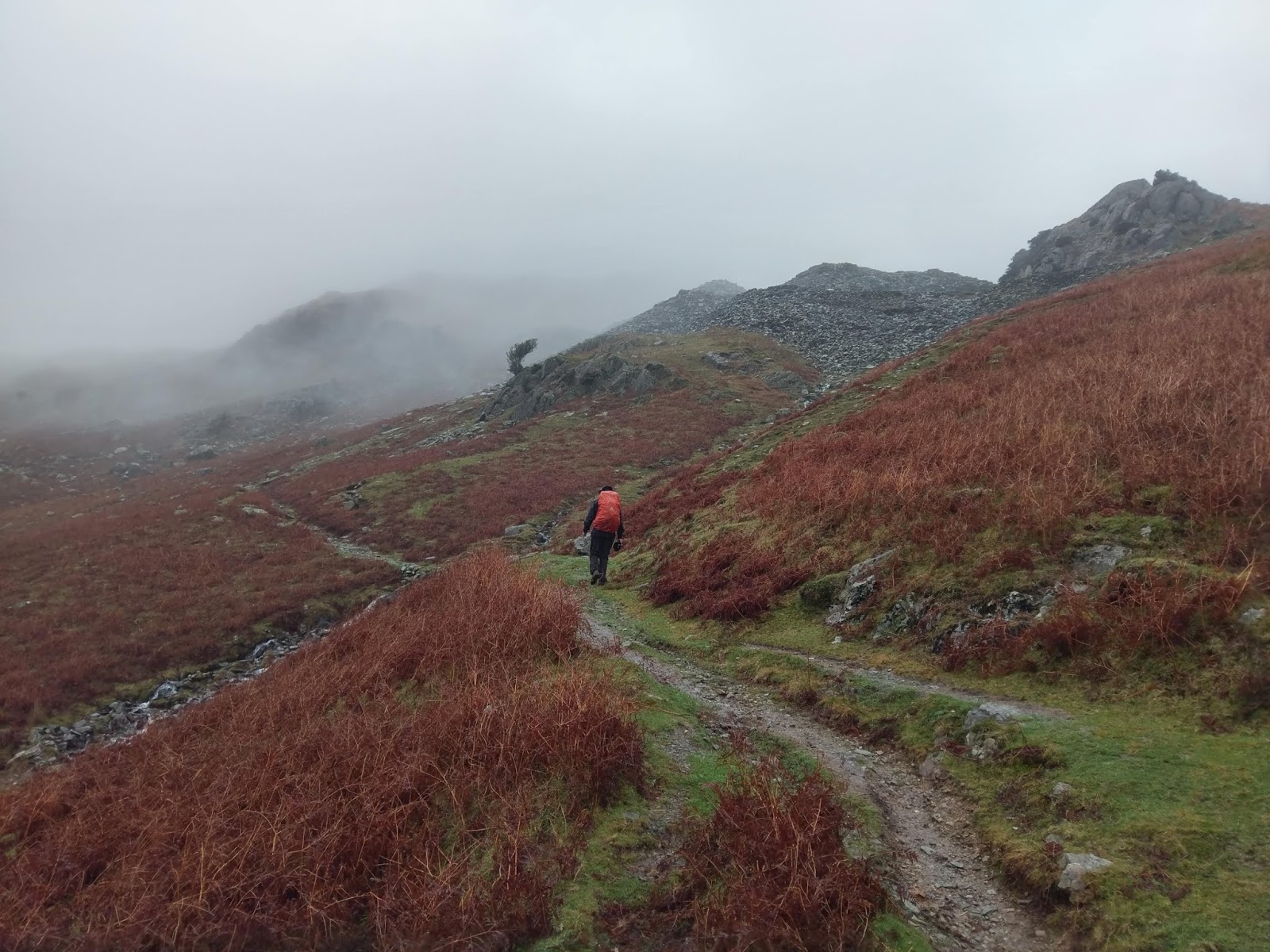 Weather-wise, we were in for an almost carbon copy day; rain, rain and, perhaps more rain if we were lucky. Bearing this in mind, we used the opportunity to use two cars; one parking in Coniston and one at Tilberthwaite. We set off, with the rain pouring, following the road into the Coppermines Valley. As we reached the hydropower weir, we branched off to start our climb up to Hole Rake.