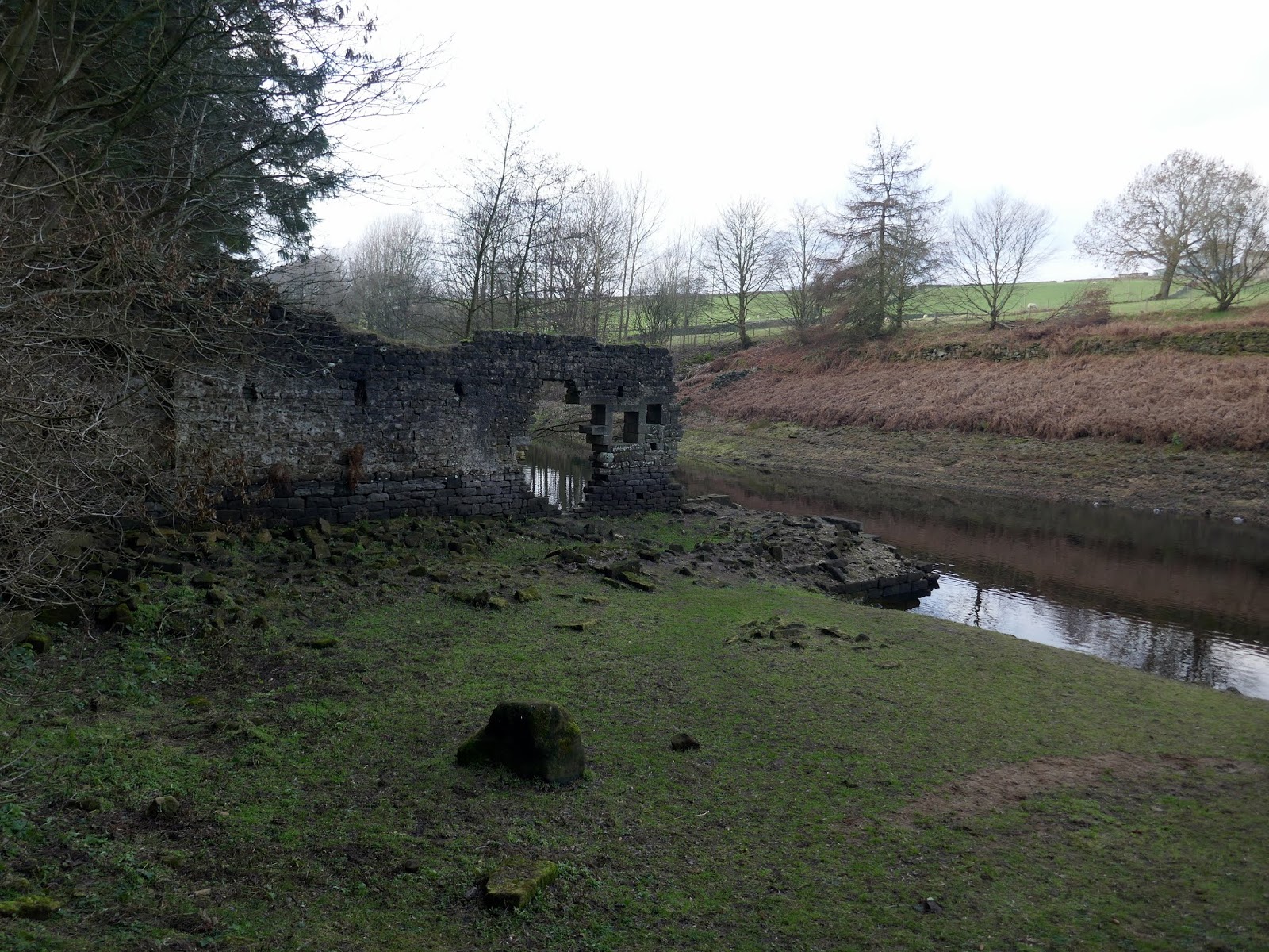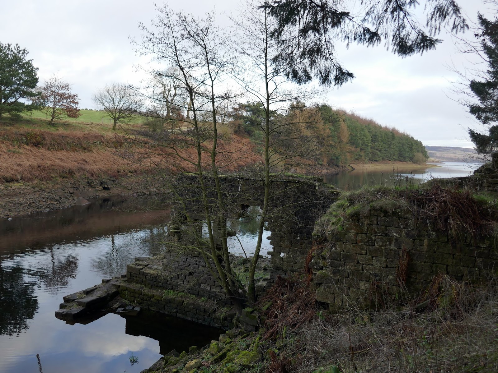 We followed the road downhill to a bridge crossing Capelshaw Beck, a small stream which flows into Thruscross Reservoir. It is possible to follow the reservoir shore from here though it’s not clear from the map. On the shoreline are the remains of the flax mill at West End, the flooded village I mentioned previously. In particularly dry weather the foundations of some of the cottages appear. It’s rumoured that the old river bridge is hidden in the depths too.