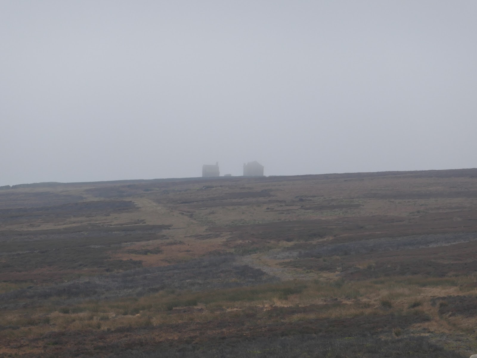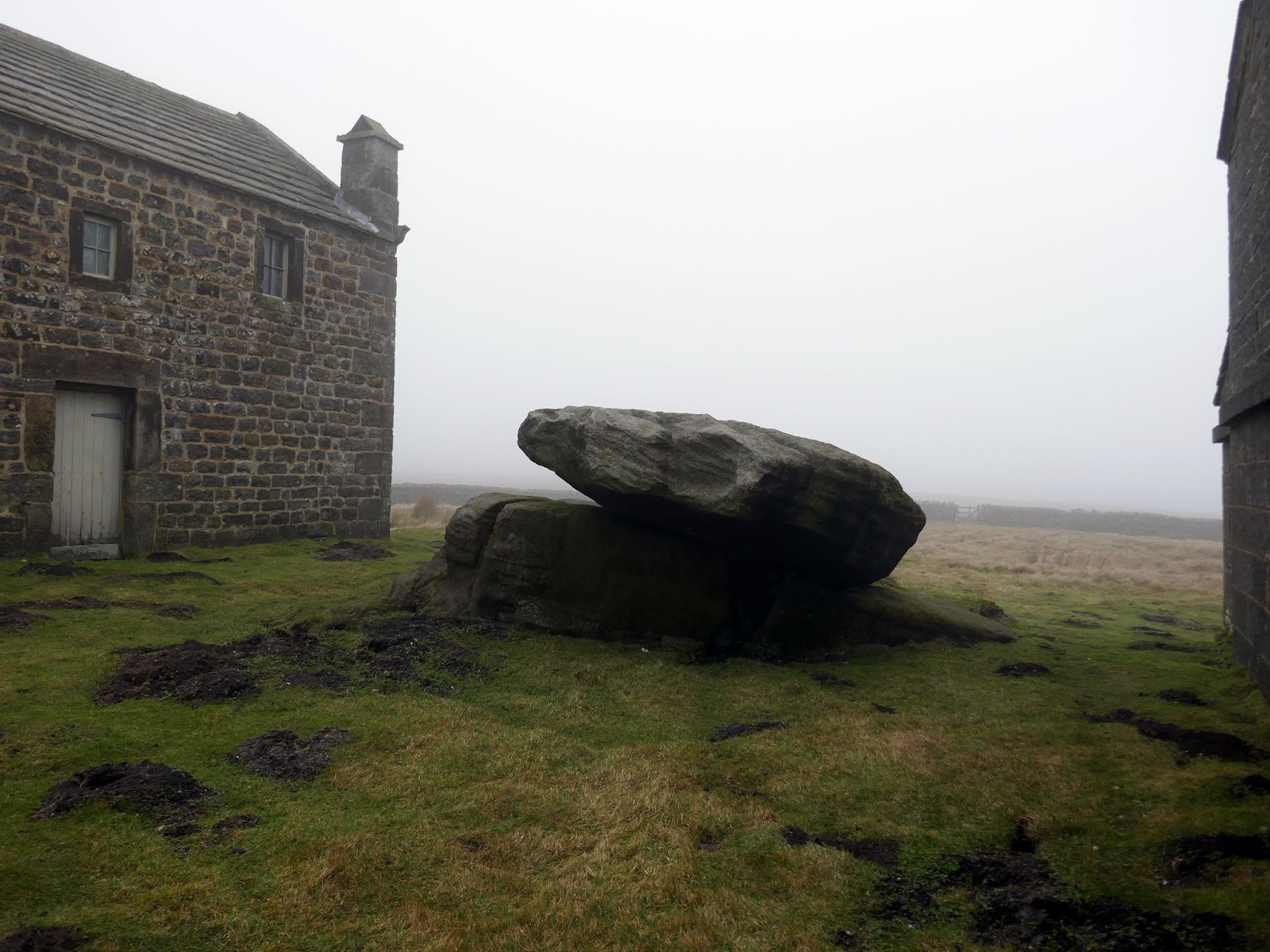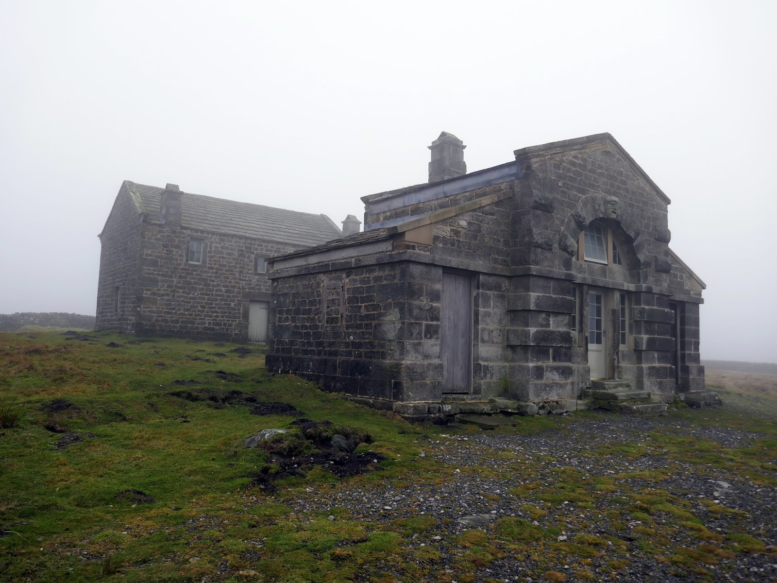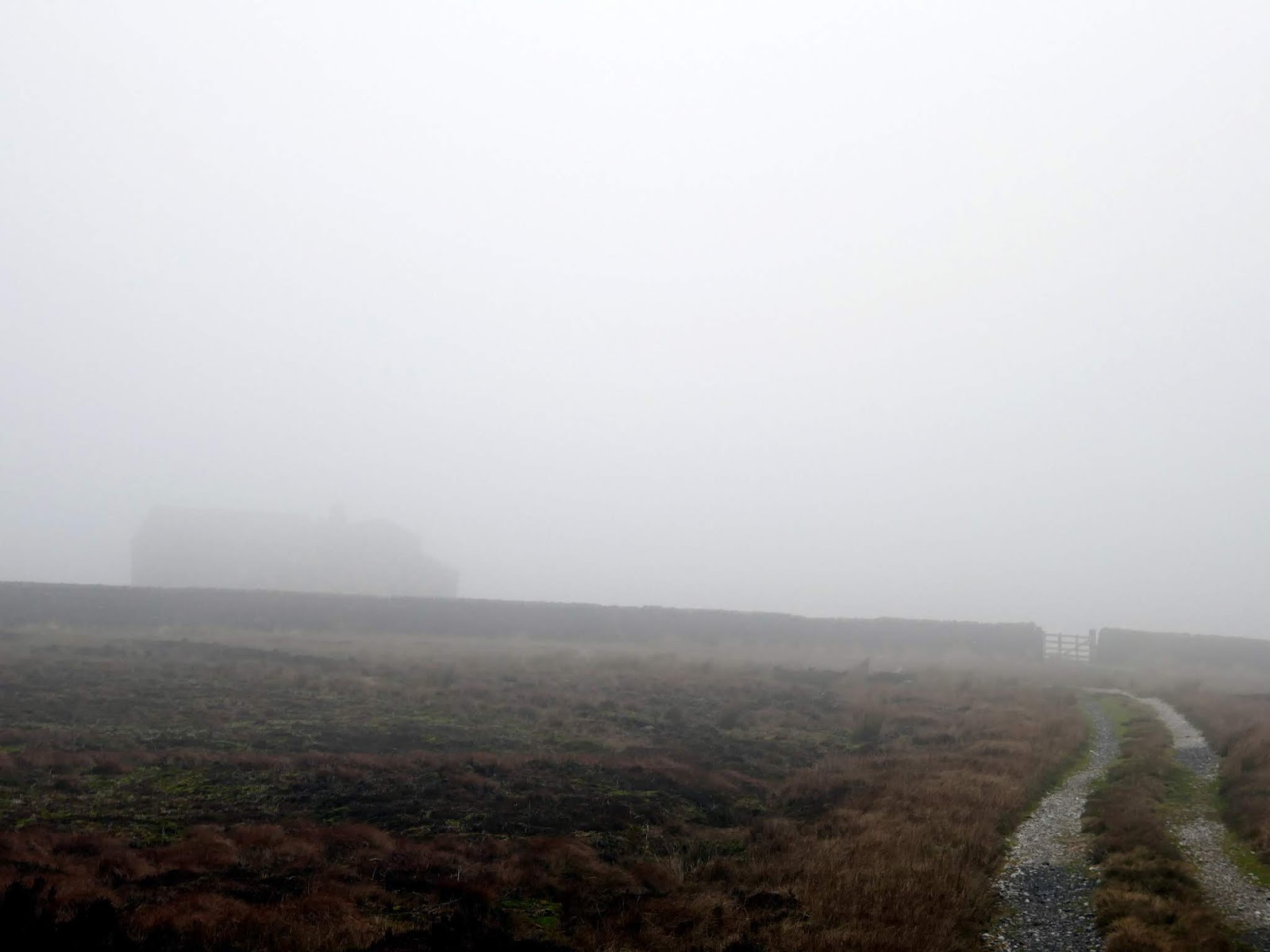 The track climbs gradually over a couple of miles, rising into the mists atop the moor. At the highest point is Rocking Hall, looming out of the mist on this occasion.