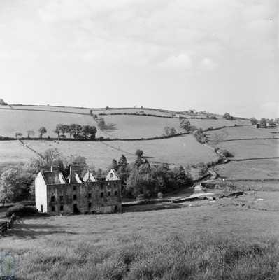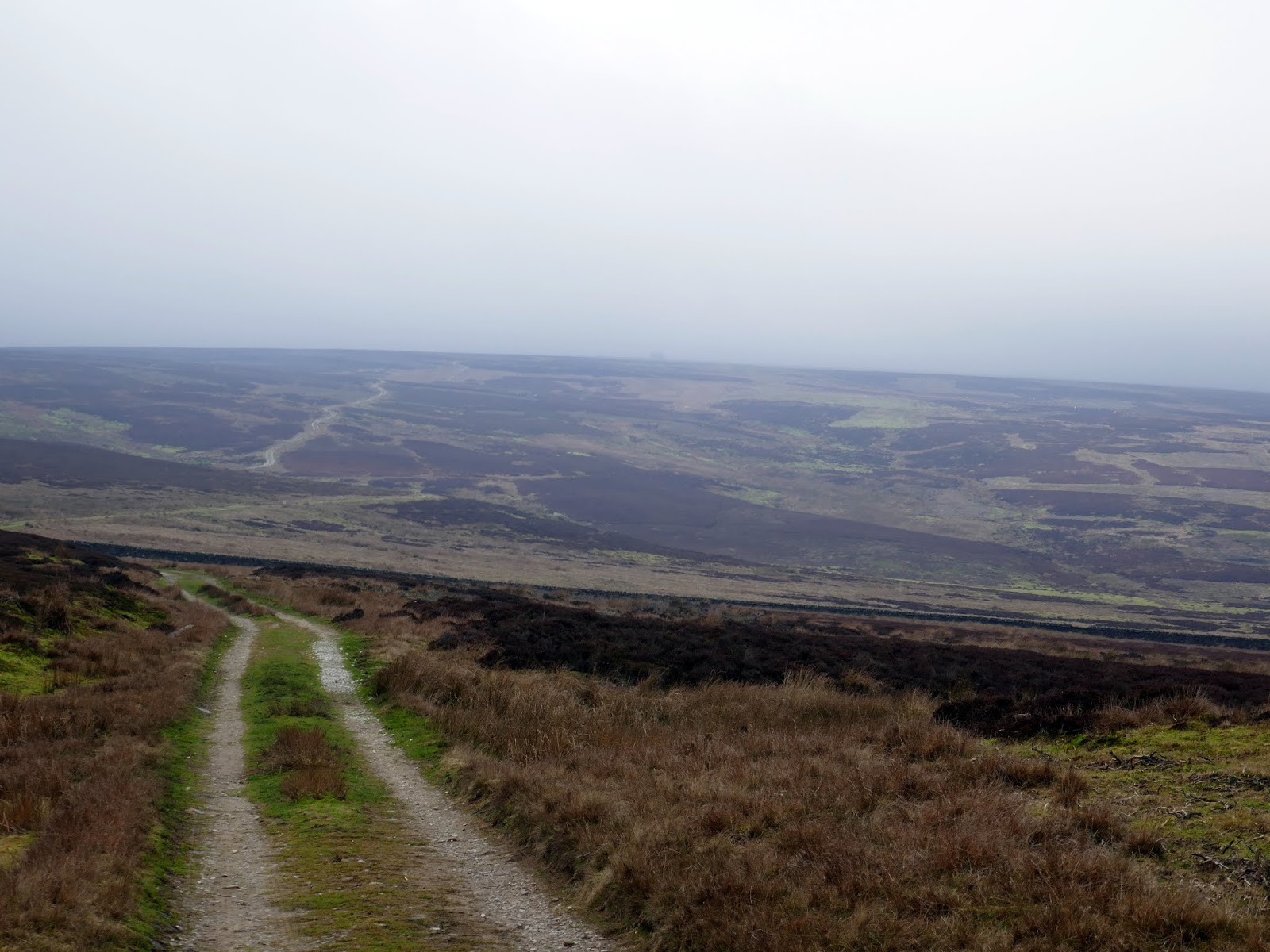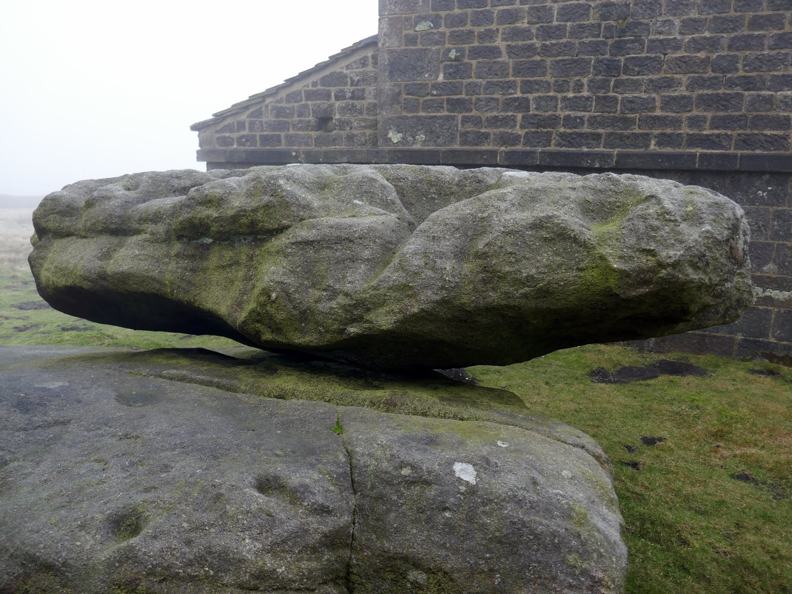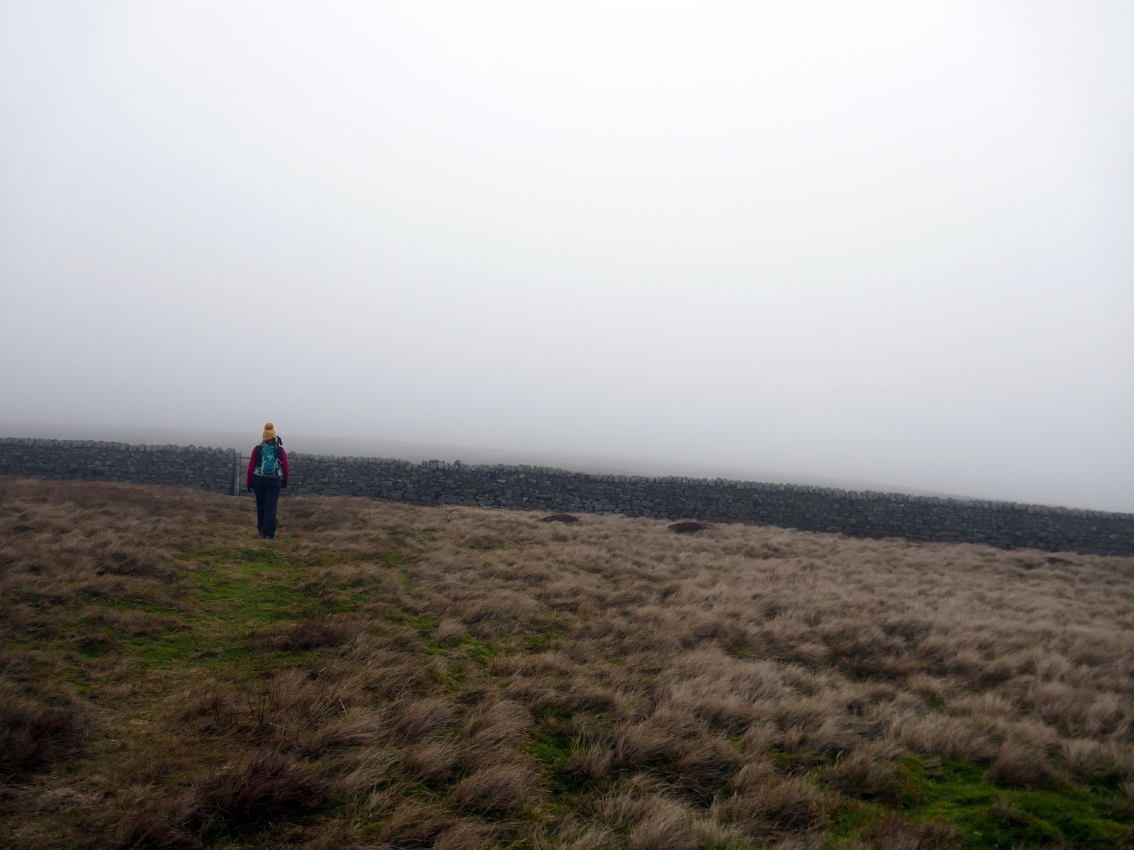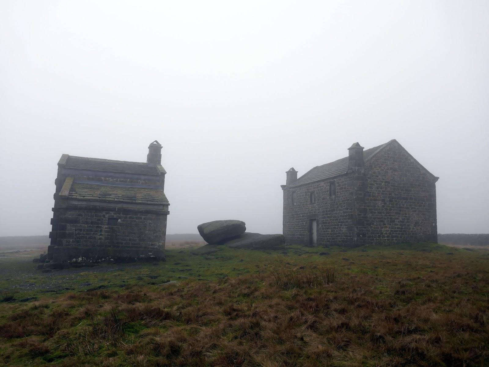 The track climbs gradually over a couple of miles, rising into the mists atop the moor. At the highest point is Rocking Hall, looming out of the mist on this occasion.