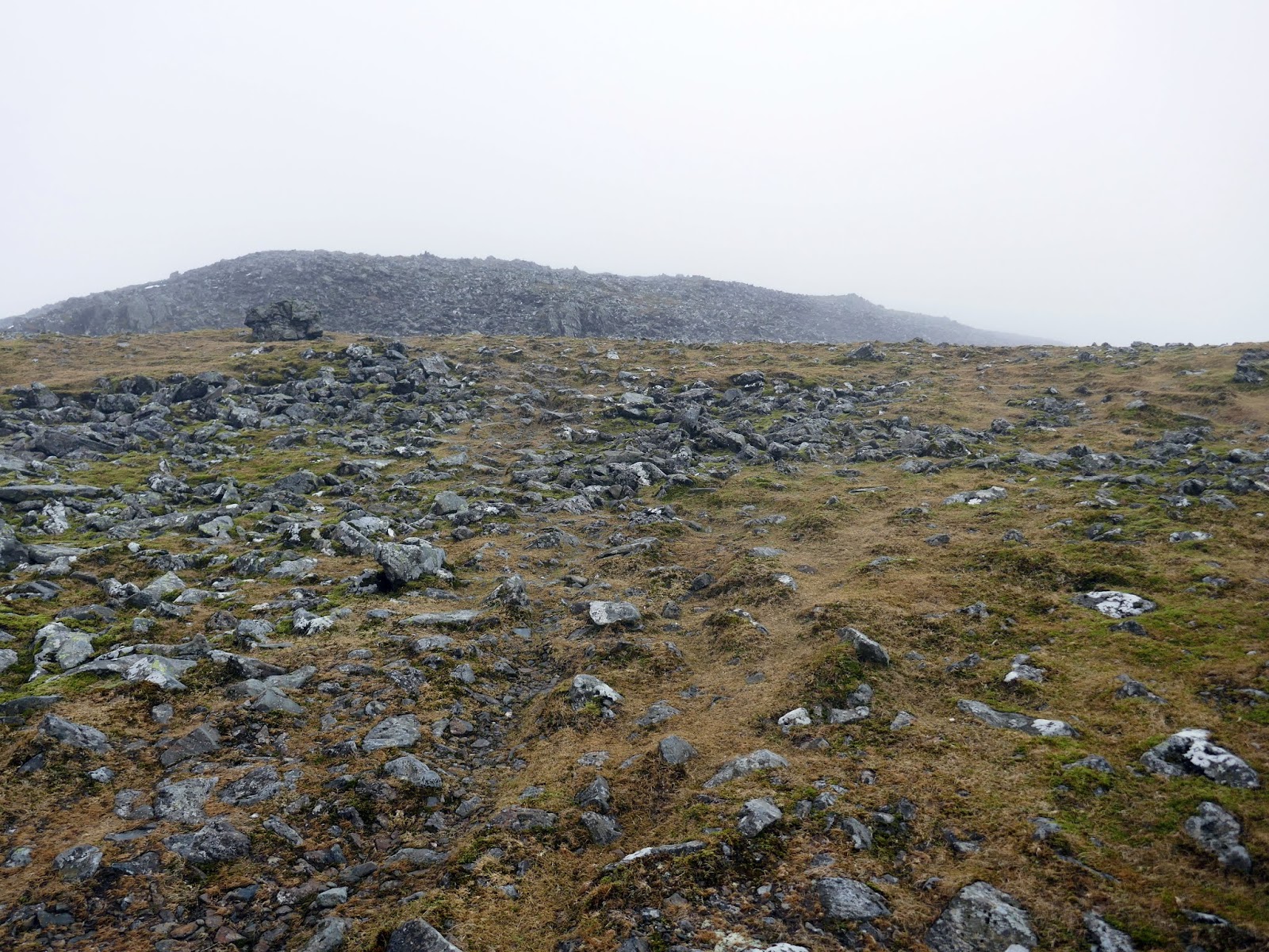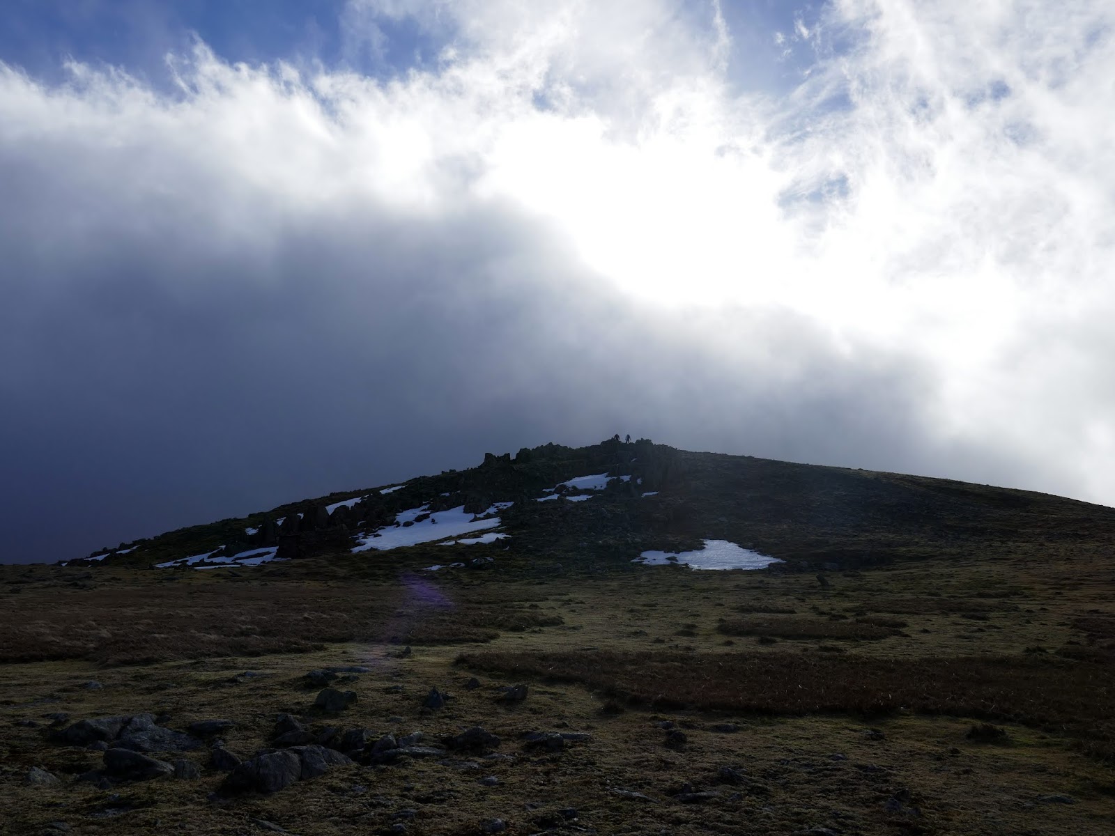 We pressed on, now entirely within the cloud. The climb to Carnedd Llewelyn is easy enough, though the obvious paths evident earlier in the day now stat to diminish. Given the time of day and the weather, we decided against heading out to Yr Elen on this occasion. By the time we had reached the summit of Carnedd Llewelyn, it had started raining and the wind had picked up again. It was looking like a wild couple of hours.