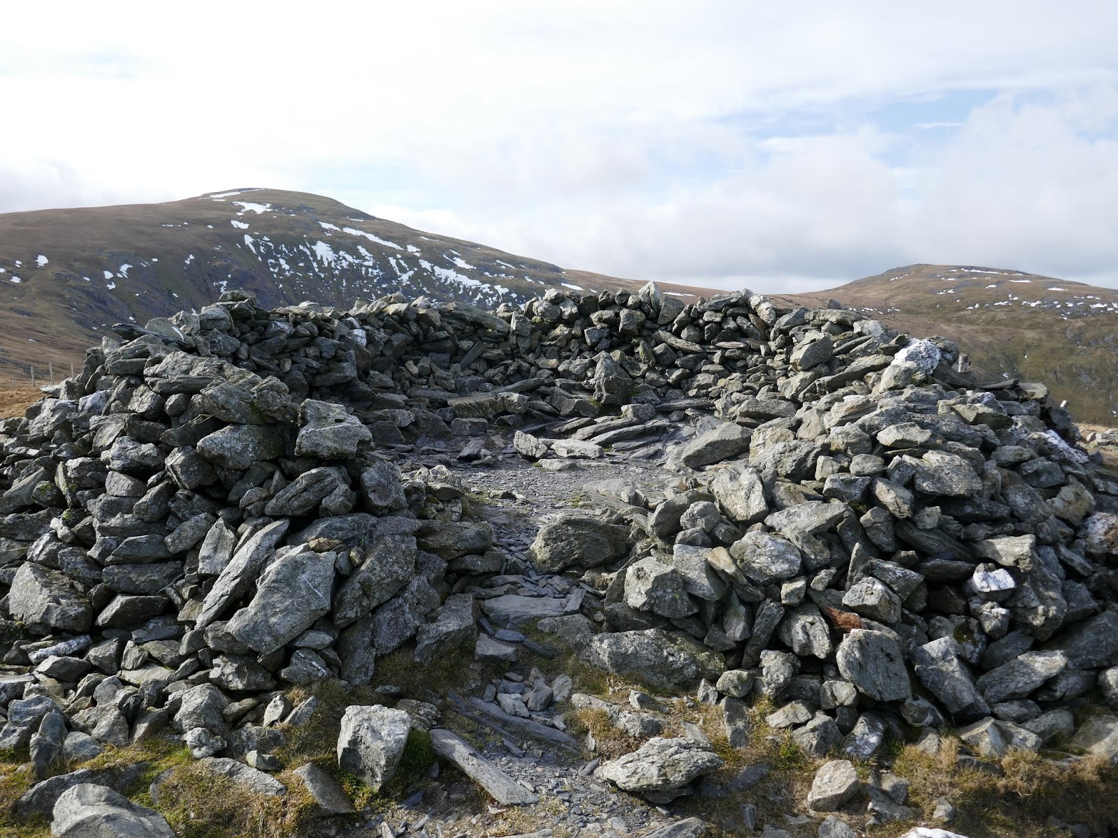 Clouds were being kicked up by the larger mountains on the ridge, sweeping over the hills to the north, casting roving shadows across the landscape. As we made the short climb to Foel Grach, we entered the gloom. We had expected to use the stone-built emergency shelter to take a break from the wind while we stopped for lunch but, sadly, the door was blocked by a pack of solid snow, barring our entry. we had to make do with sitting in the shelters’ shelter, so to speak.