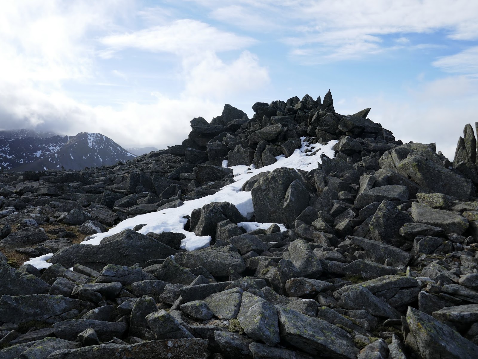 Foel-fras it topped by a cap of boulders, strewn around in all directions. In fact, the remaining high fells of the Carneddau sport a similar appearance with grassy slopes topped by boulders. Despite being February, little in the way of snow remained after a series of warm, wet days had managed to wash the majority of it away – quite different to this day I had on Snowdon only a couple of weeks before. At Foel-fras, the path meets a drystone wall which runs along the top of the mountain.