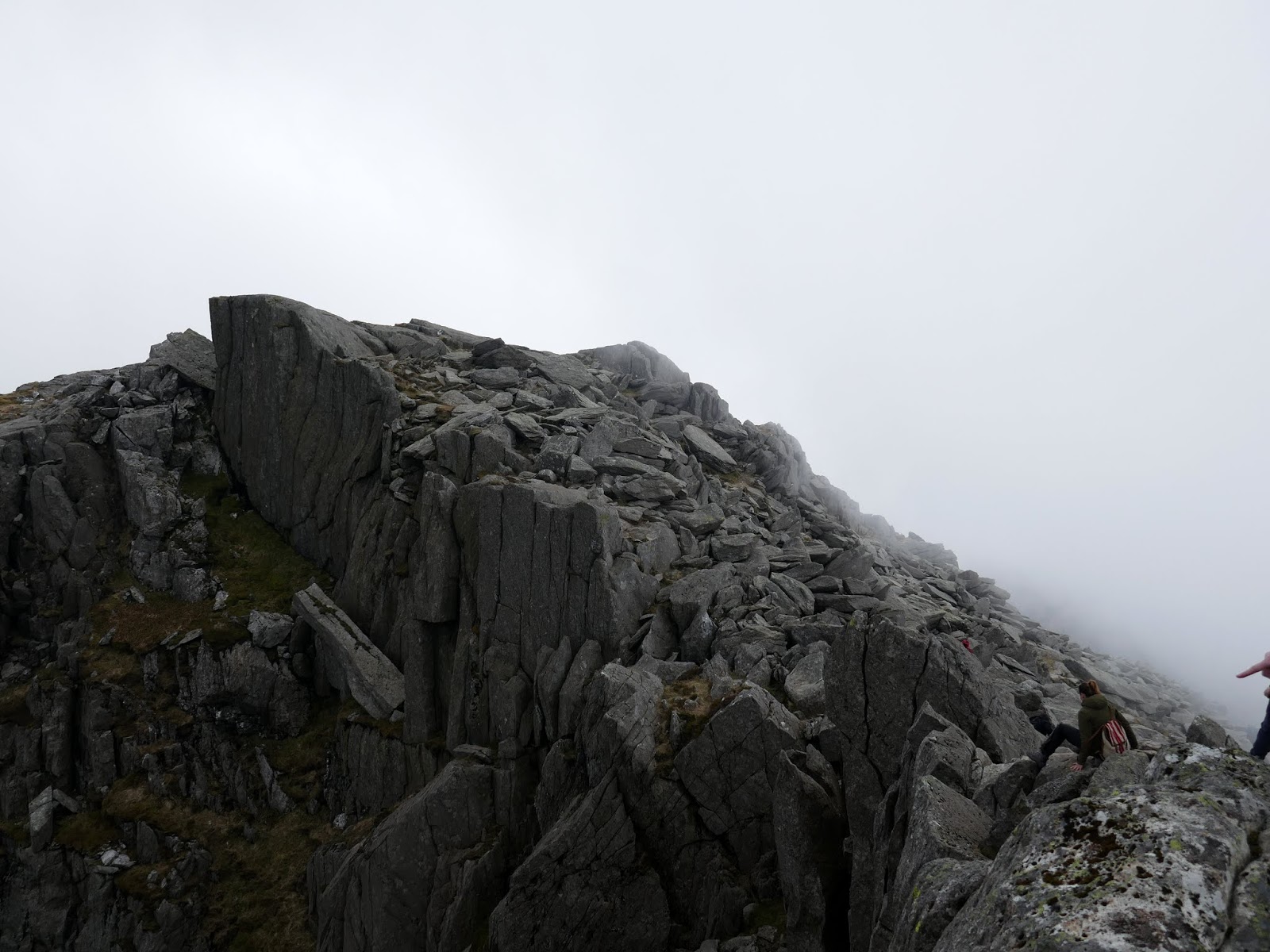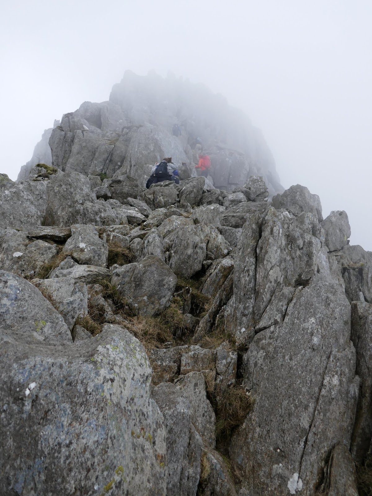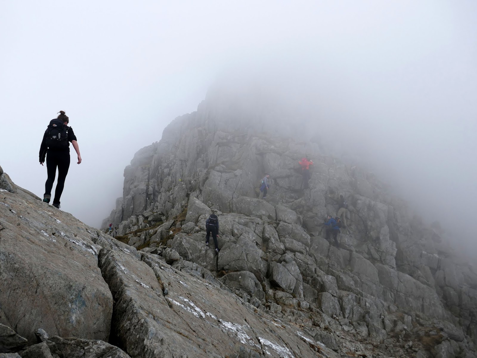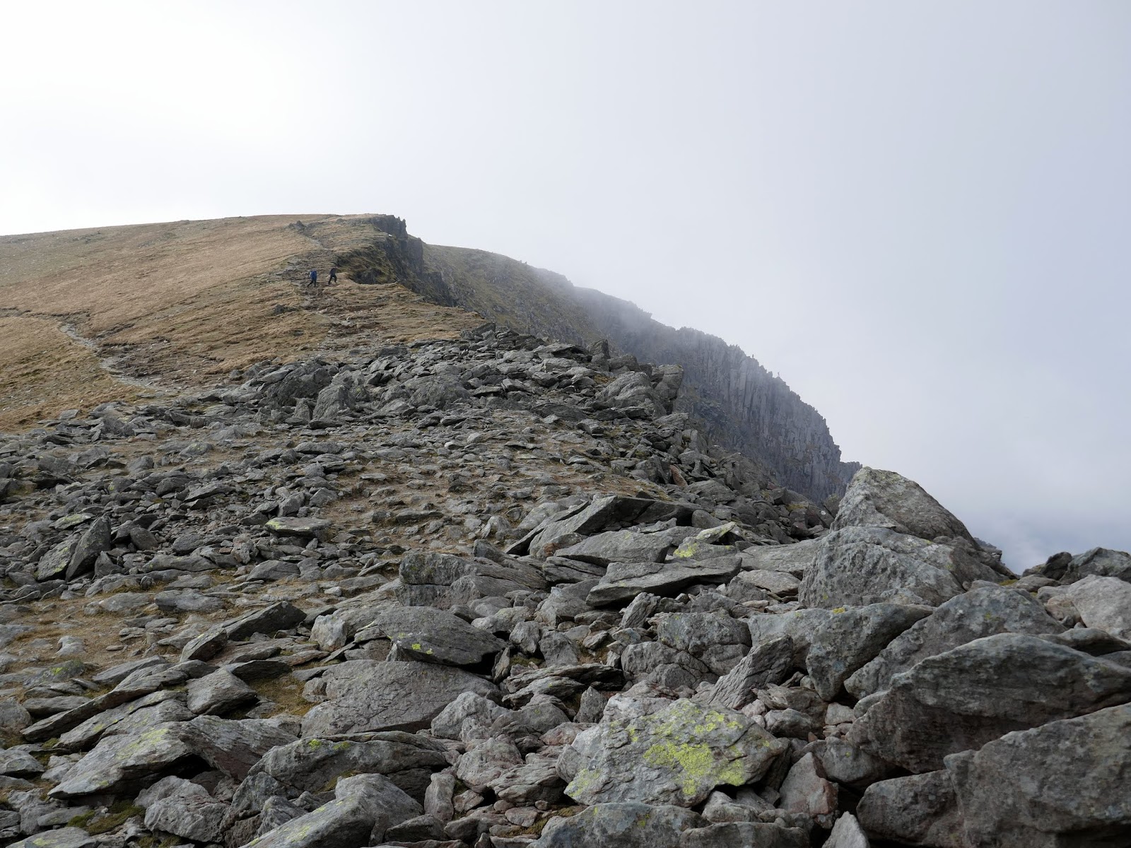 The Nose is an imposing pyramid of rock that bars the north ridge route. By far the best way is to tackle it head-on. Again, the main routes should be easy to pick out given the amount of polished rock. We opted for a slightly different line to avoid a queue forming though still remained around a scrambling grade of Grade 1 with the odd 2 thrown in for good measure. If you chose to bypass the nose, a path skirts to the left, cutting across the slopes and a number of gullies. I’d highly recommend you attempt to climb the first gully (the upper reaches of Nor Nor gully) to get back up onto the ridge before you find yourself on uncertain ground.