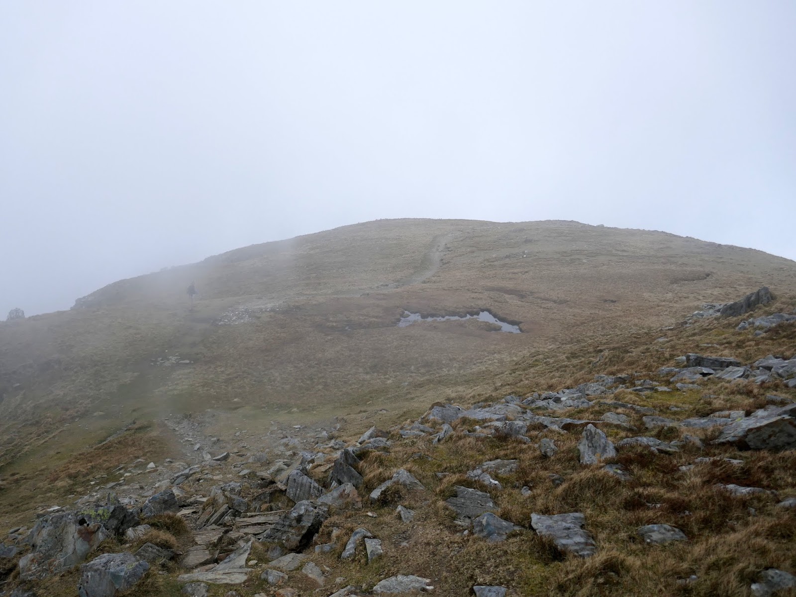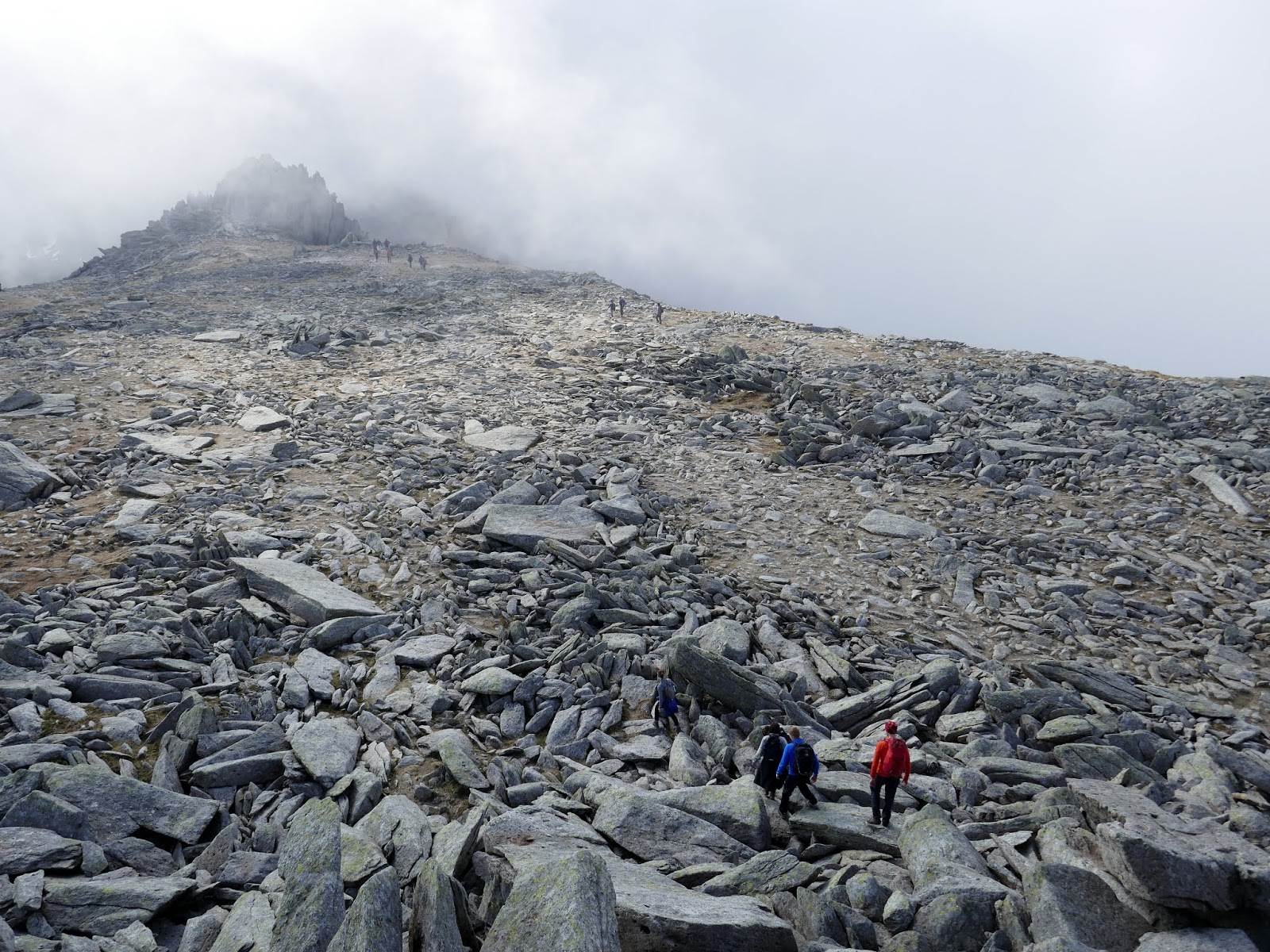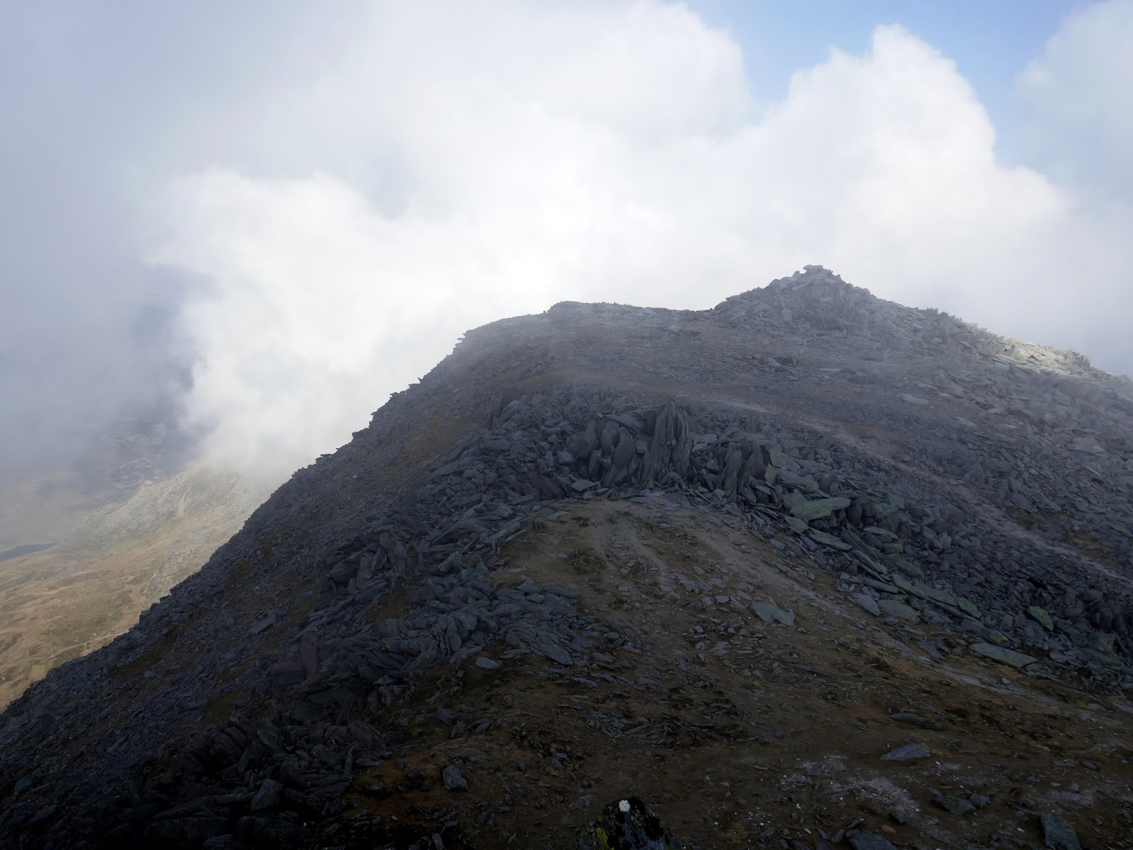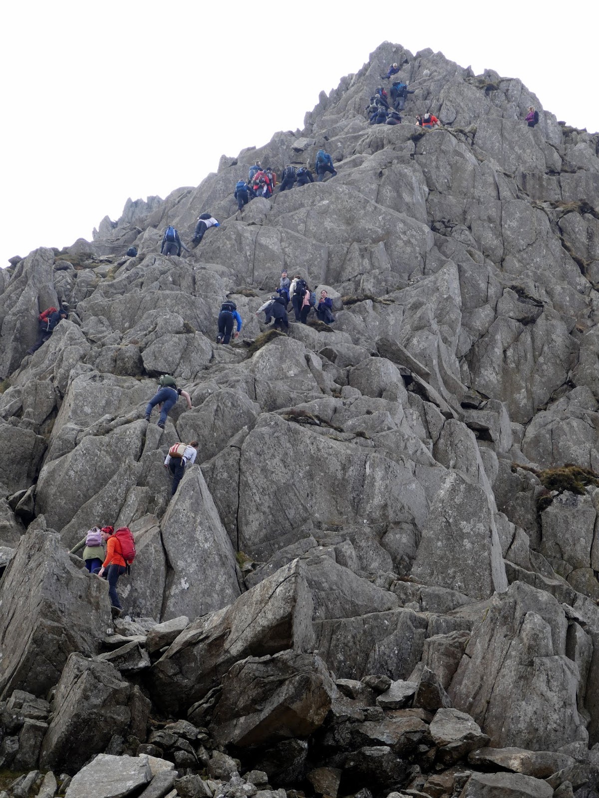 The Nose is an imposing pyramid of rock that bars the north ridge route. By far the best way is to tackle it head-on. Again, the main routes should be easy to pick out given the amount of polished rock. We opted for a slightly different line to avoid a queue forming though still remained around a scrambling grade of Grade 1 with the odd 2 thrown in for good measure. If you chose to bypass the nose, a path skirts to the left, cutting across the slopes and a number of gullies. I’d highly recommend you attempt to climb the first gully (the upper reaches of Nor Nor gully) to get back up onto the ridge before you find yourself on uncertain ground.