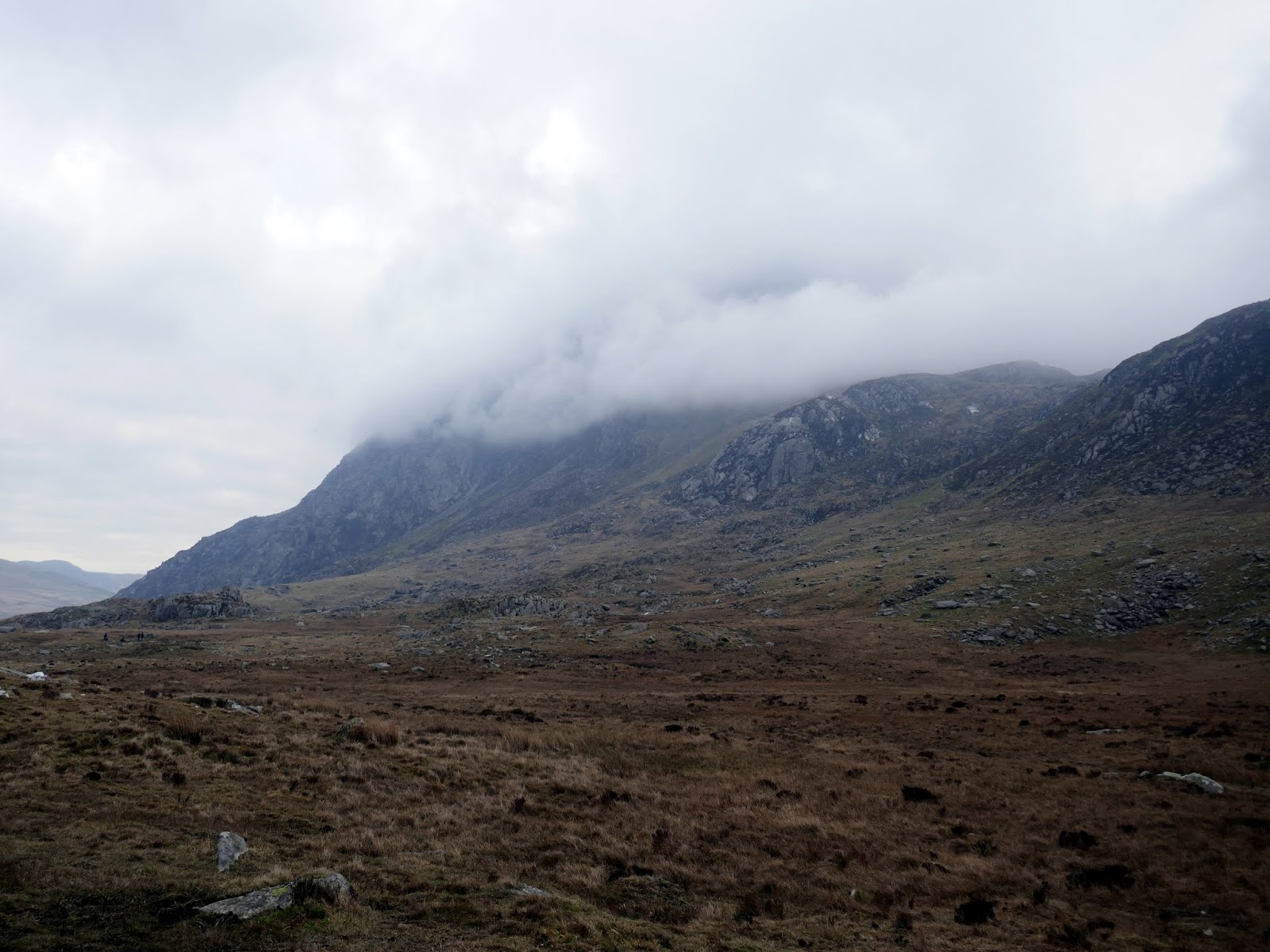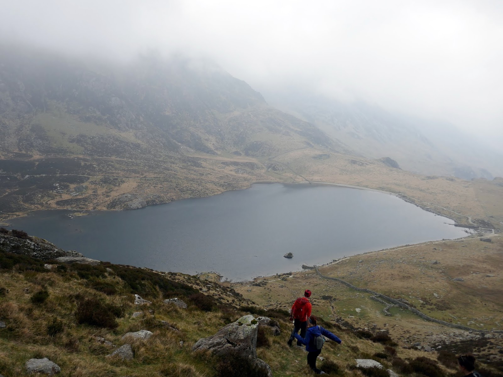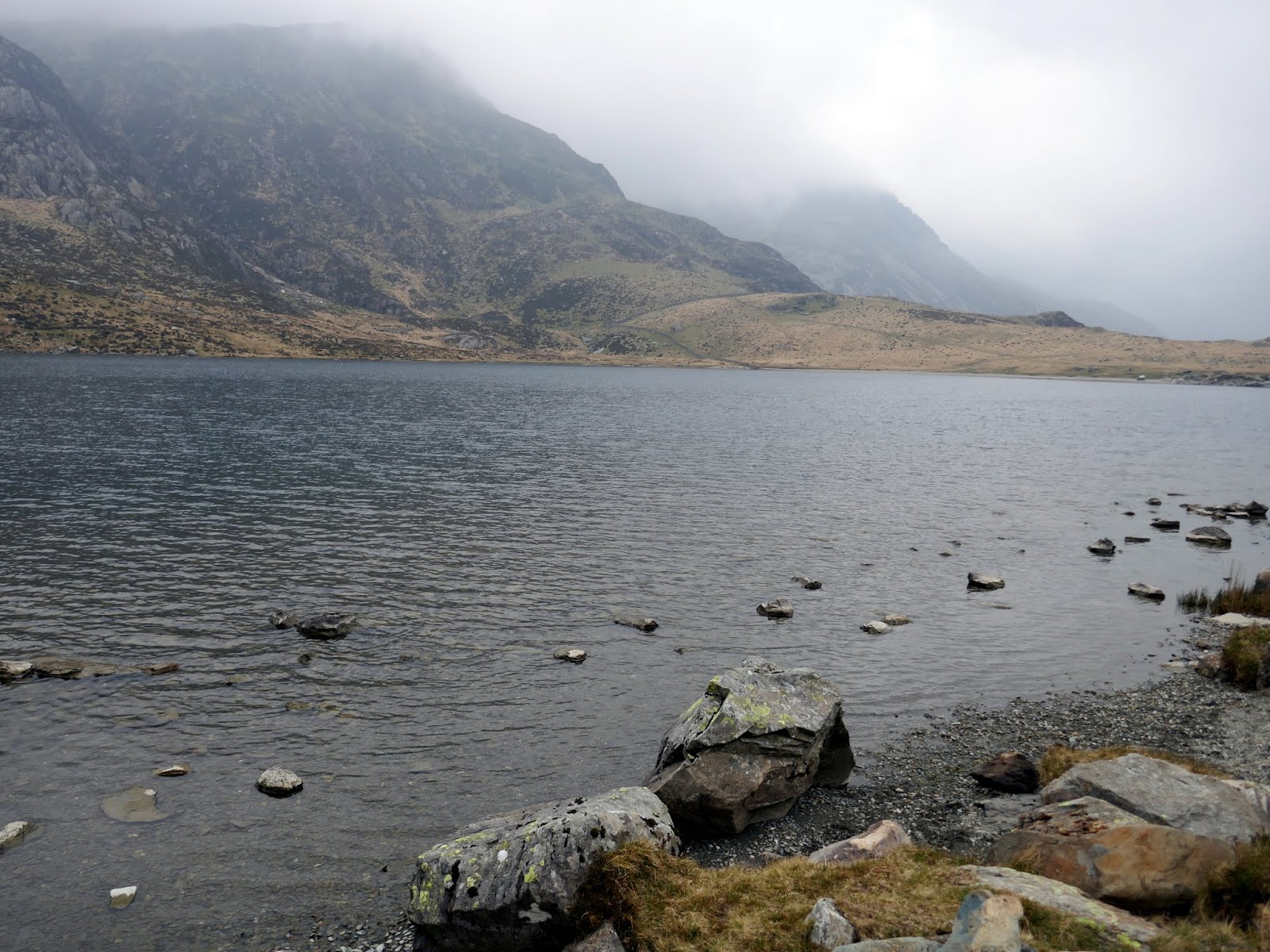 From the football field, we followed another path which descends firstly towards Llyn Bochlwyd before cutting across towards Llyn Idwal. By now the clouds had returned, shrouding the main summits in mist. We crossed some pathless ground until we reached the shore of Llyn Idwal. From here it’s a simple stroll back to the hostel.