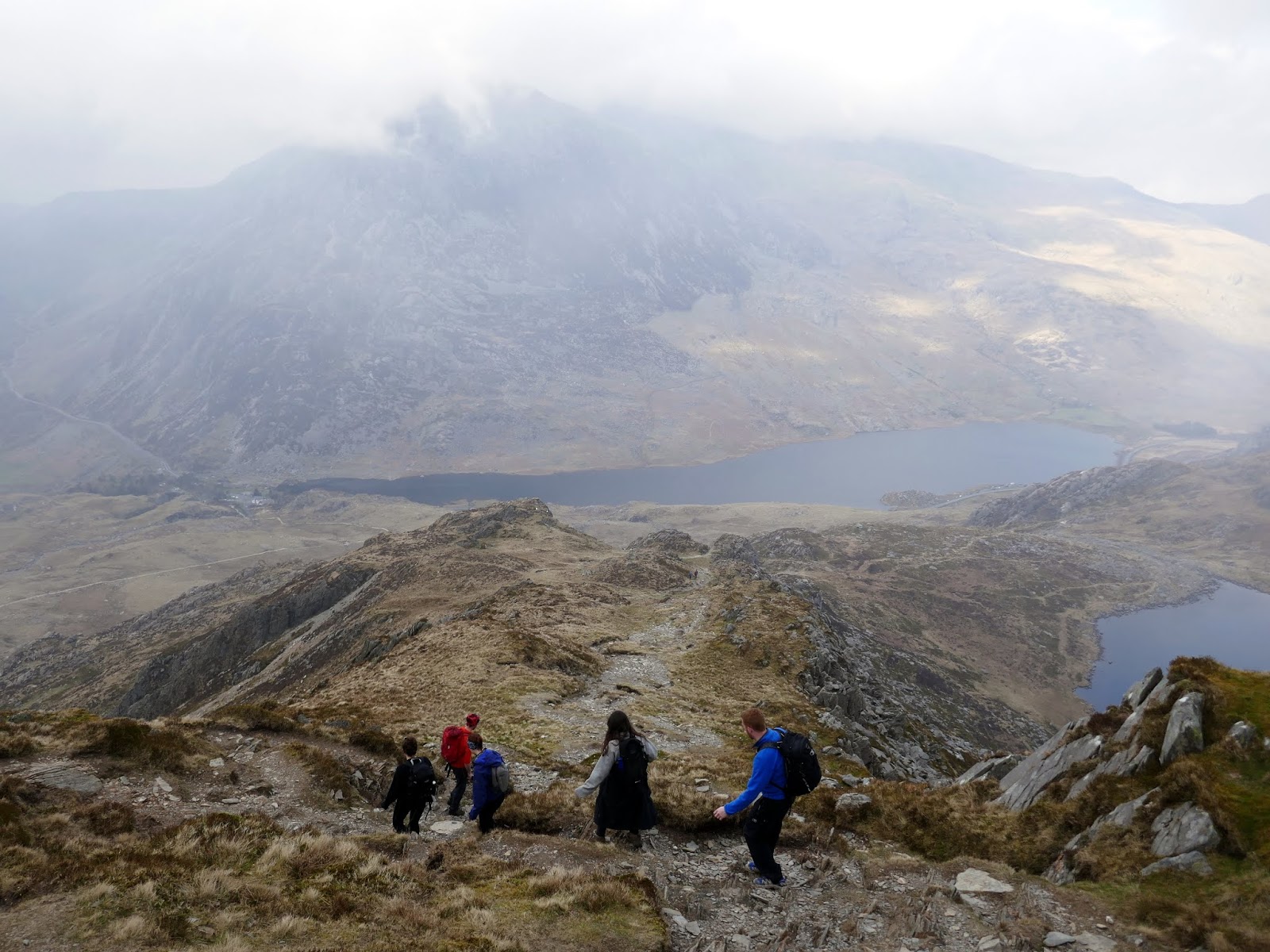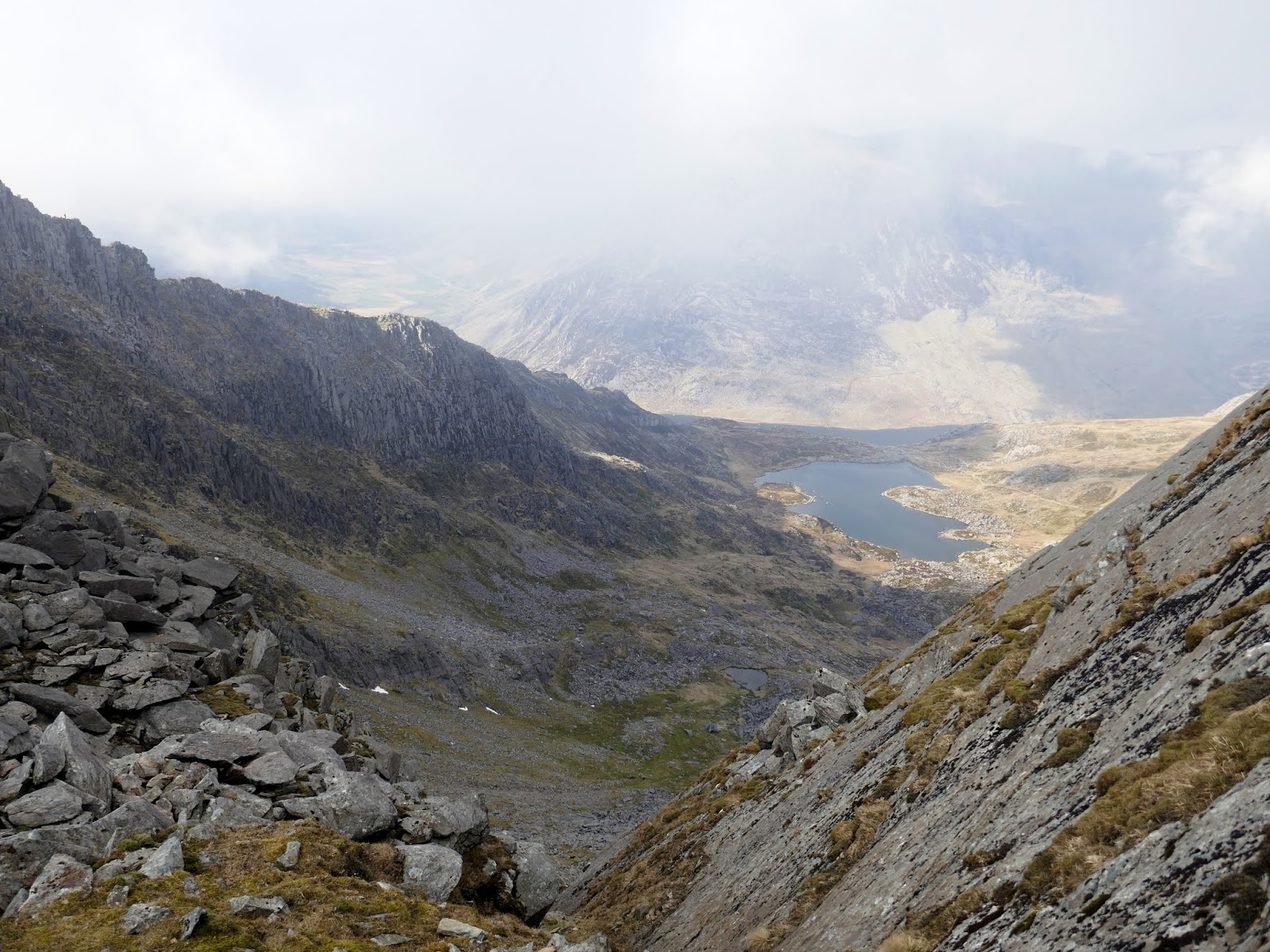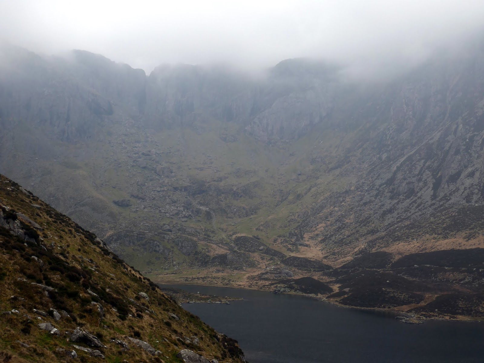 From the football field, we followed another path which descends firstly towards Llyn Bochlwyd before cutting across towards Llyn Idwal. By now the clouds had returned, shrouding the main summits in mist. We crossed some pathless ground until we reached the shore of Llyn Idwal. From here it’s a simple stroll back to the hostel.