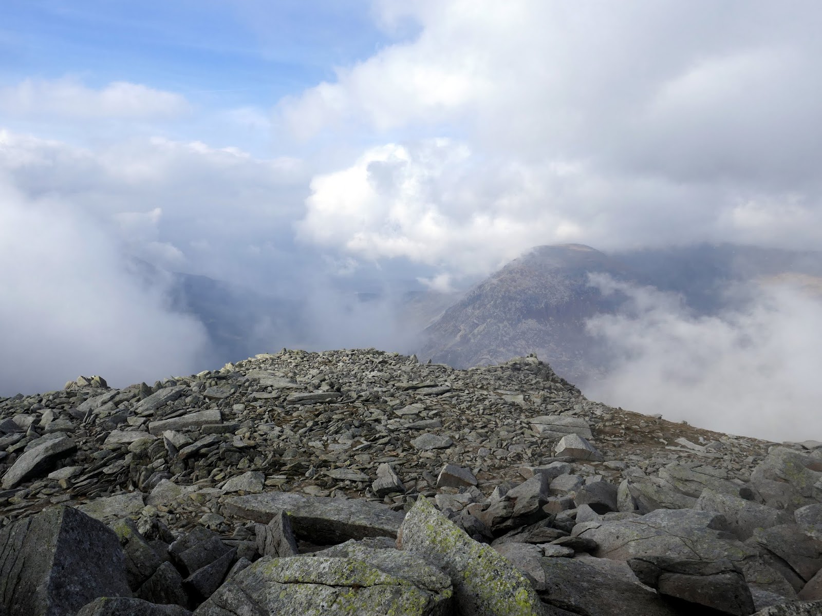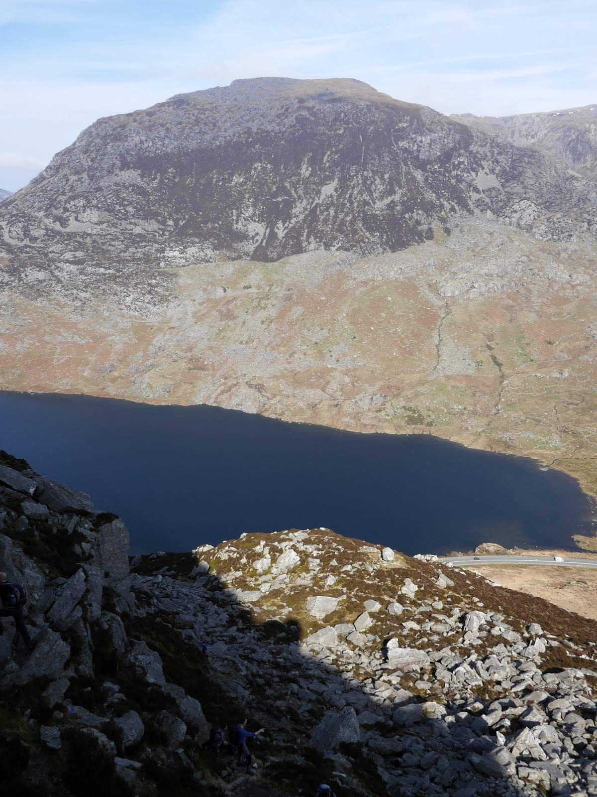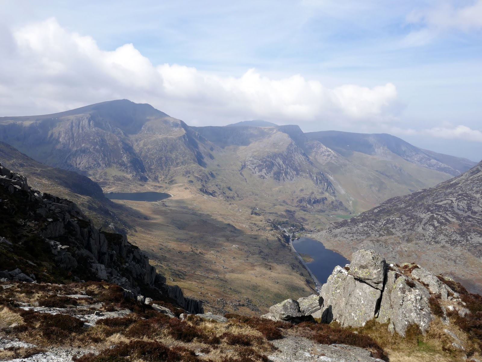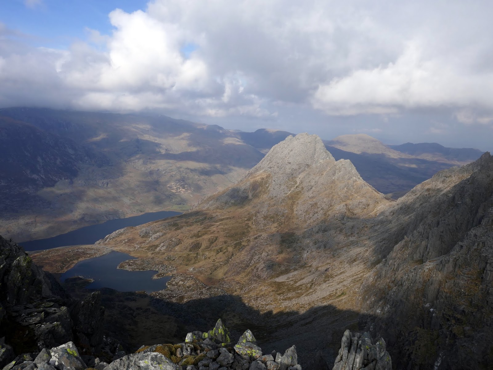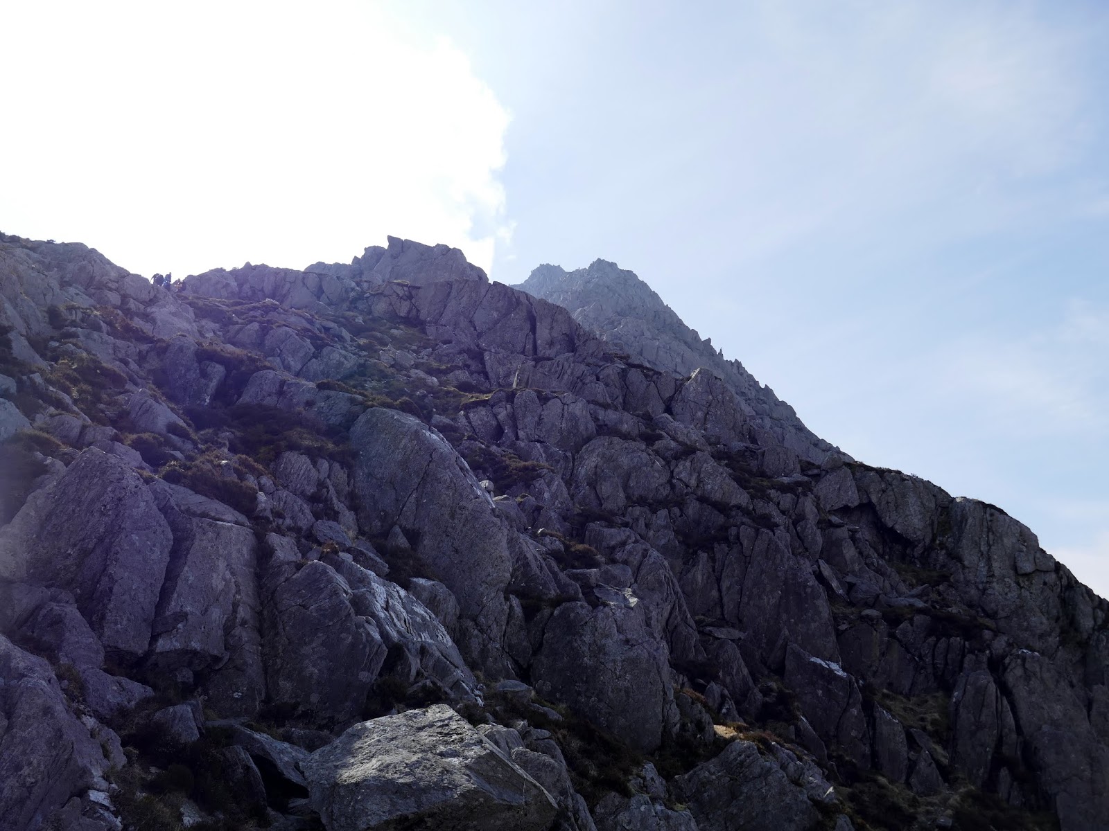 The clouds had all by broken by the time we had crossed Glyder Fach. Beyond Castell y Gwynt, the path crosses Bwlch y Ddwy-Glyder, skirts around the head of Cwm Bochlwyd and onto Y Gribin and further scrambling.