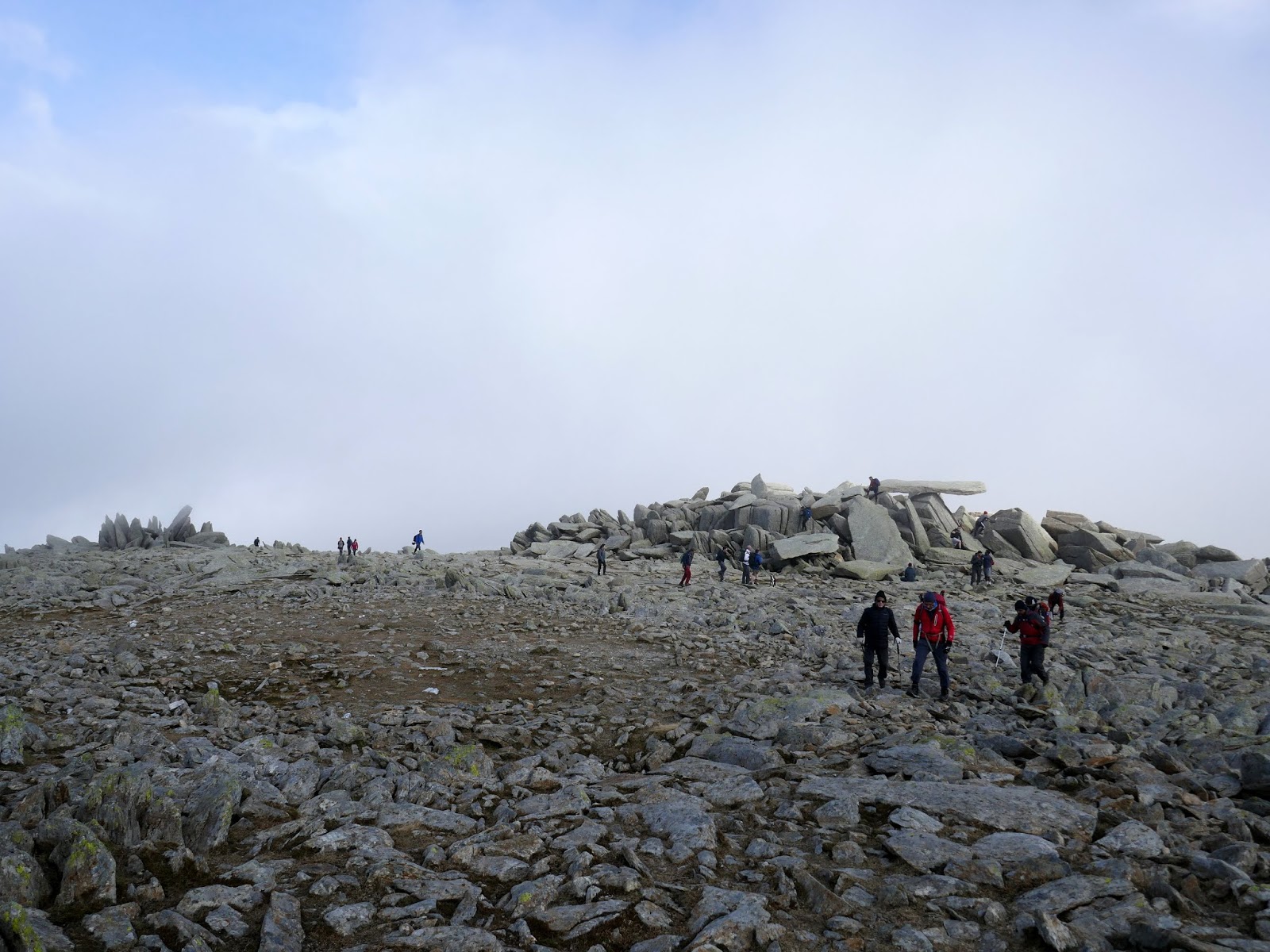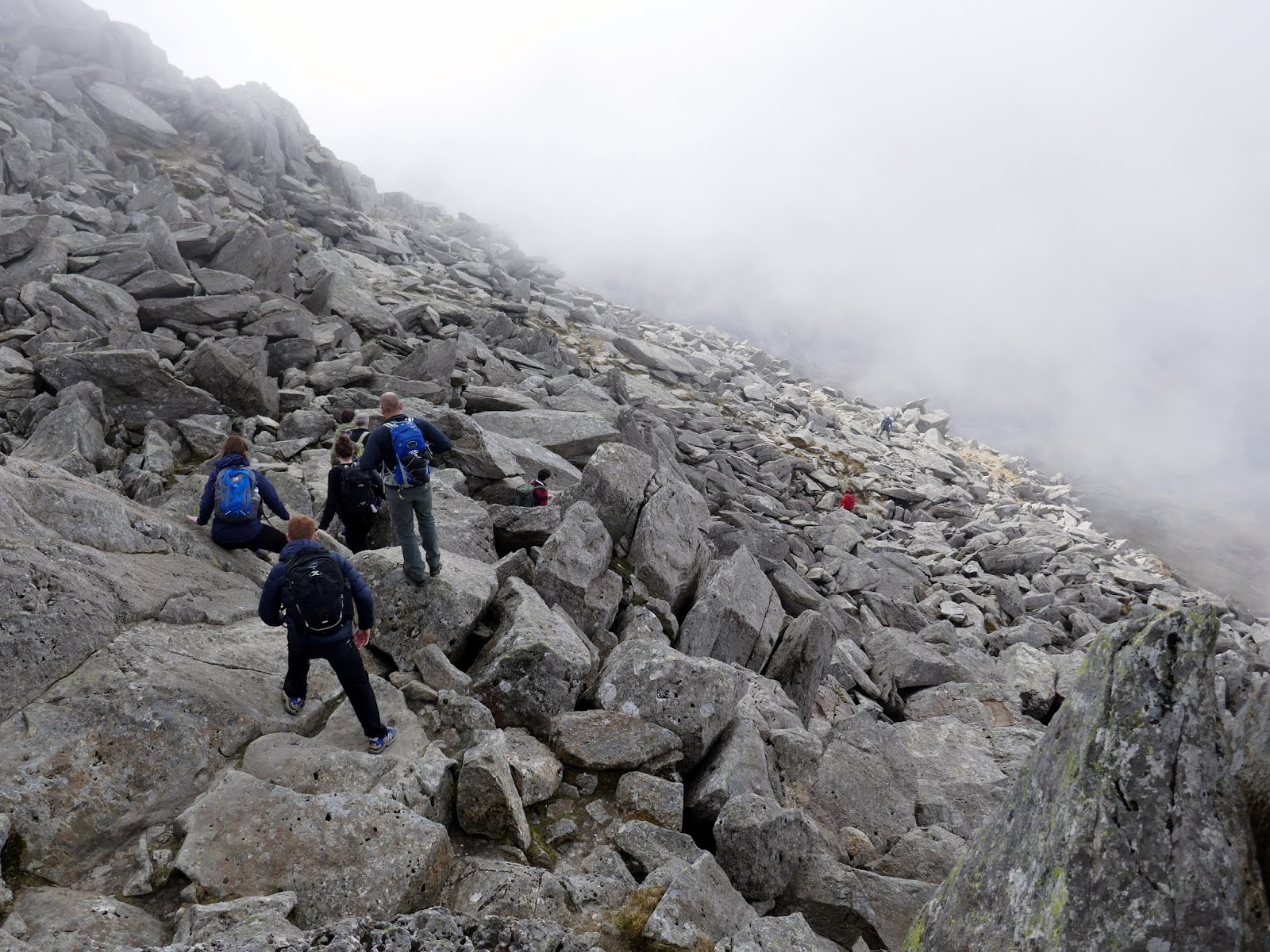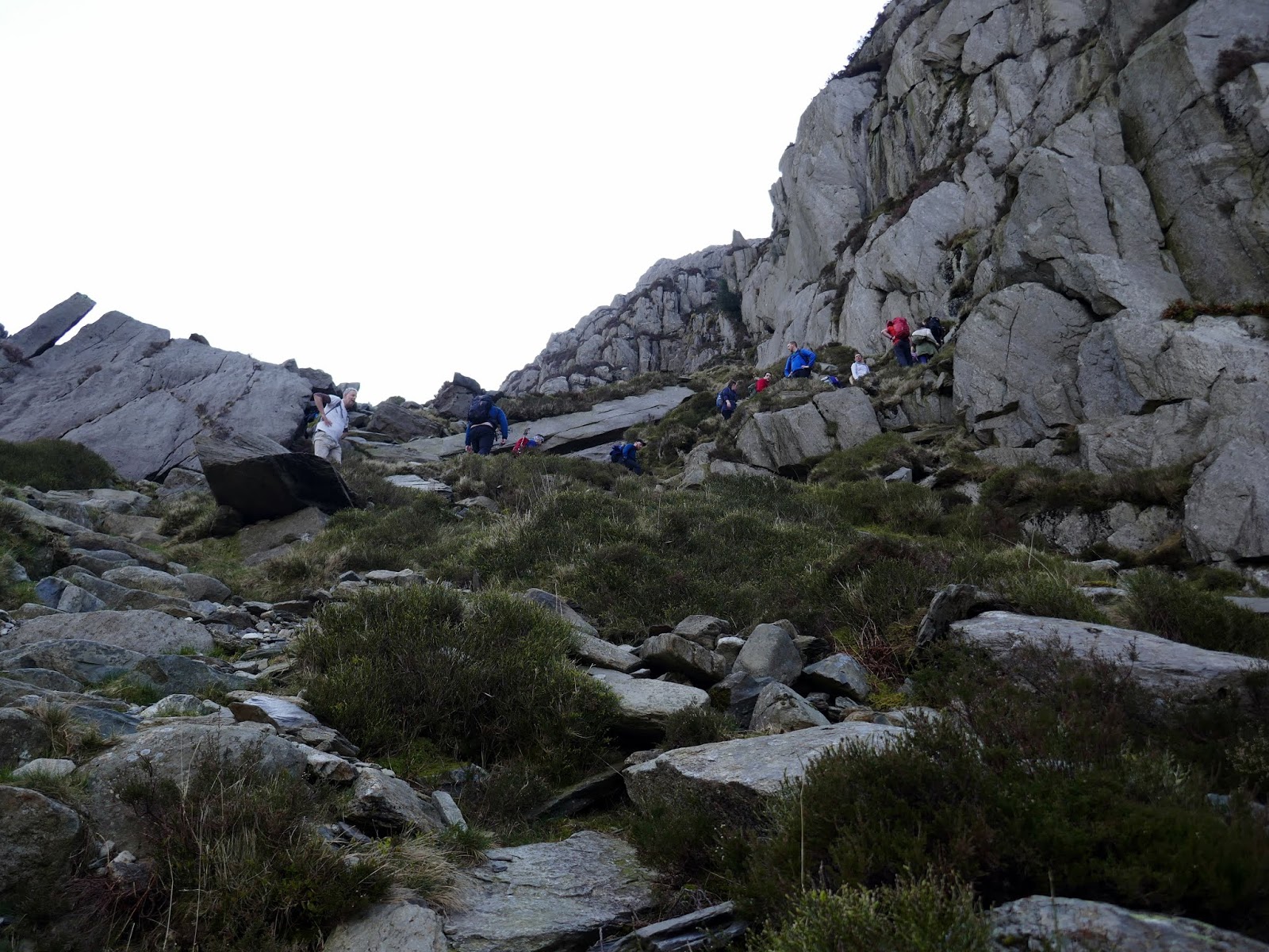 We followed the path until we reached a heather covered shoulder, an obvious landmark among a sea of rock. We were aiming to reach the crest of the ridge, the most direct and easy to follow line towards the summit. Here, a scree-strewn path starts to climb up and around a seemingly impenetrable wall of rock (no doubt experienced scramblers will enjoy finding their own way up) and before long, reaches a relatively flat area with a large cairn – an area supposedly known as Piccadilly Circus as it can get very busy.
