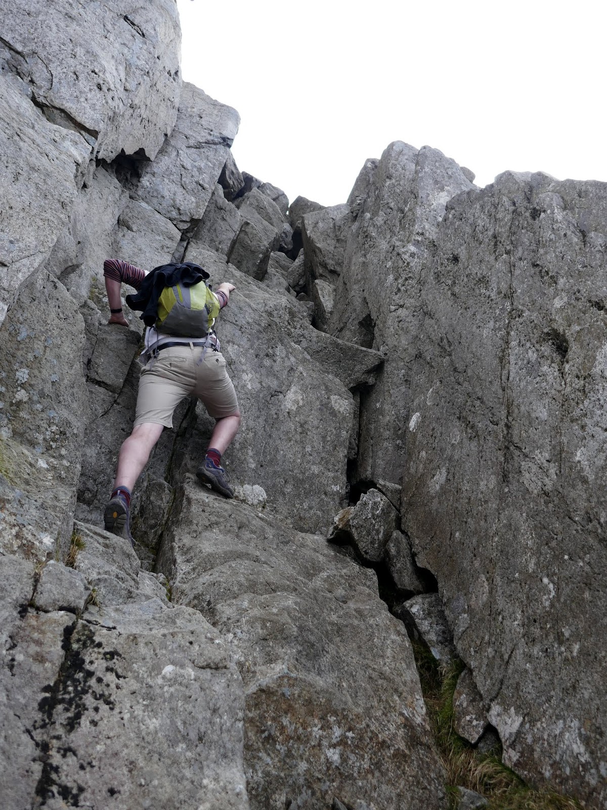 Getting to the notch requires a tricky downclimb though, as ever, there are hand and footholds when you search them out. The downclimb leads to a fairly narrow, flat slab which can be lethally slippery when wet. Upon first inspection, the spire of the Great Pinnacle seems to block the onwards route, however, passing around to the right reveals a blocky gully which leads back up to the ridgeline