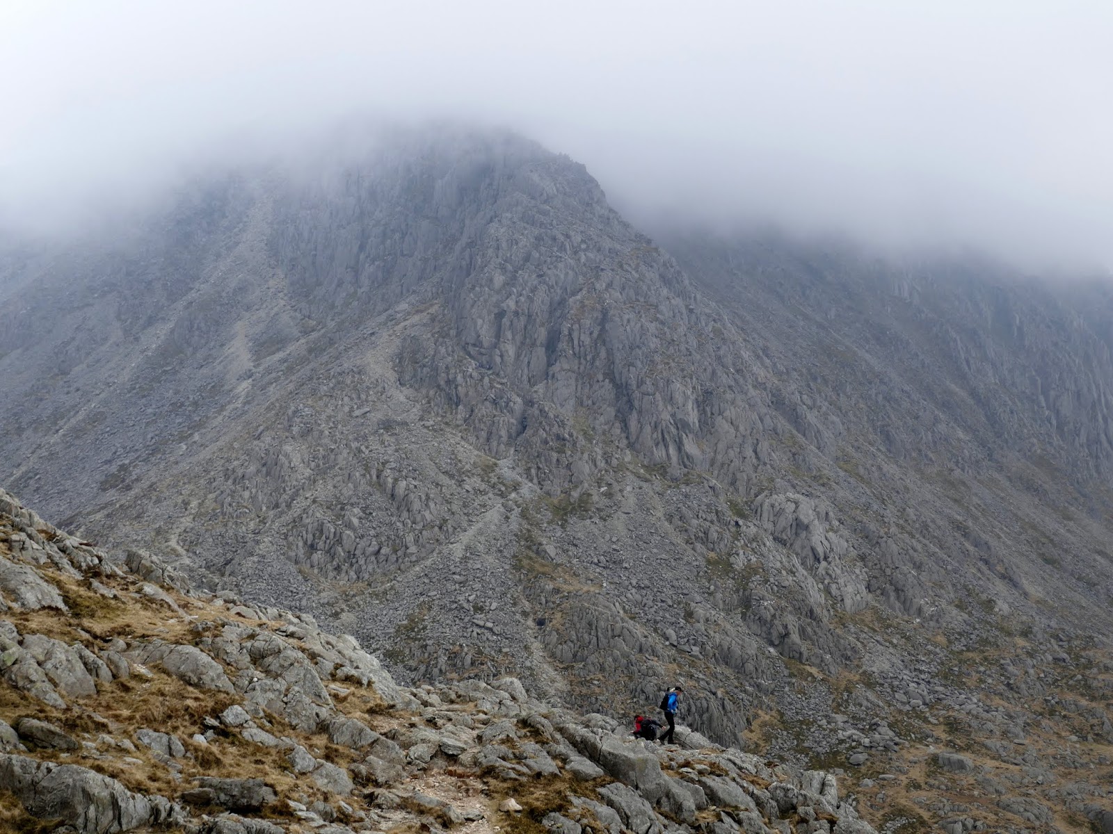 With no rain forecast but the clouds lowering, we made tracks towards Bristly Ridge where some more quality scrambling awaits. Descending Tryfan’s south ridge is easy compared to the scramble up the north and we found our way down to Bwlch Tryfan. Bristly Ridge rises up overhead.